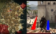 《刺客信条4:黑旗》(Assassin's Creed 4: Black Flag)里的陆地面积貌似要其前作小了很多,这一次,游戏世界的亮点不是它的宽广度,而是游戏中令人兴奋的海战区域,当然,地图中还是有很多空间来让玩家们奔跑、跳跃、攀爬等等,其传统要素依然得到了完整保留。在这张由外媒发布的最新游戏图片中,图片包含两部分,左侧的地图指示与右侧的实际世界,红线与蓝线分别表示了主角距离两座建筑物的距离,你可以通过这两条线的长度来对游戏地图与实际世界的显示比例有一个大致的了解。没准儿你已经看出来了,这一次《刺客信条4:黑旗》的游戏世界陆地面积似乎比起前作小了不少,原因很简单,为了强调本作的亮点:“全新的海战系统”,地图中的海域范围得到了大范围增加。就在上一周,《刺客信条4》的游戏制作总监奥西拉