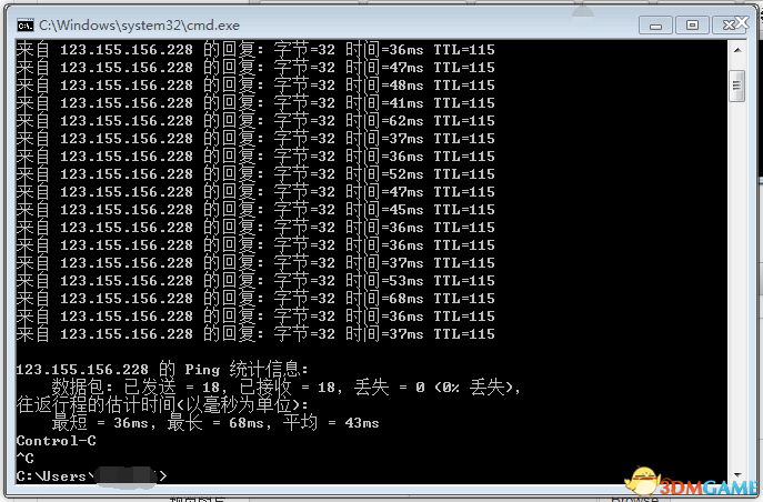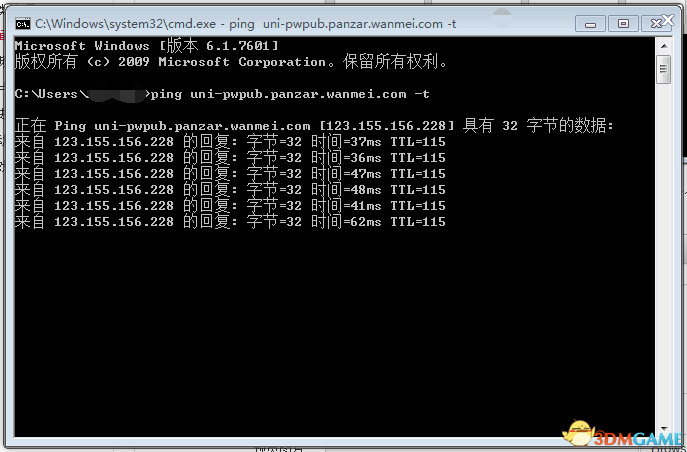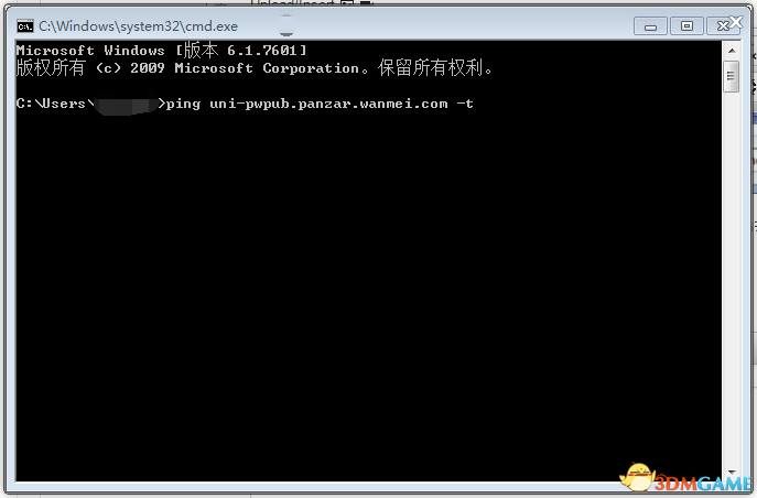 2,运行CMD后在窗口中输入 :ping uni-pwpub.panzar.wanmei.com -t 然后按下回车。