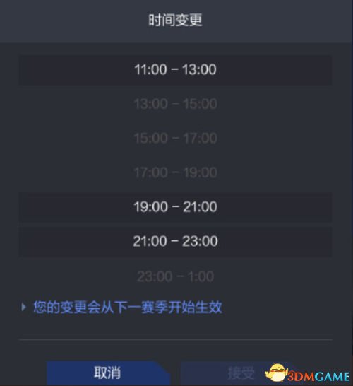 修改比赛时间段,将会在下一轮大师联赛周期生效。