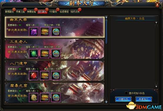 3.组队副本可以1-3人组队进入,每天进入次数不限,并且副本可以跨服组队。