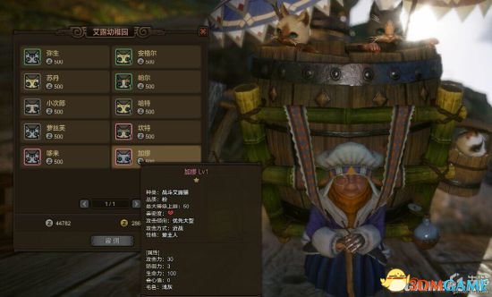 在新的艾露猫面板中,最左边是可选的艾露猫,选中后,显示相应艾露猫的属性、装备和技能