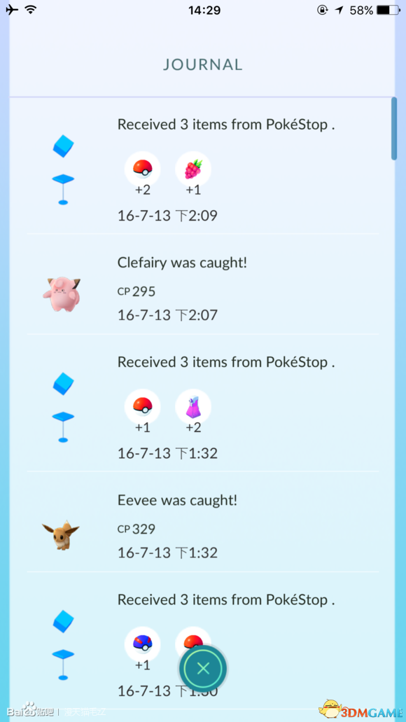 从上下往下时间倒叙,可以看到路过的补给点和抓到的精灵