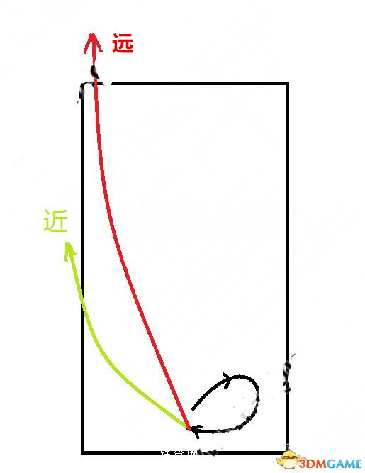 大概在这两条线的区间里面,近的如果飞过头,在绿线的地方划的时候放慢速度,远的打不到在红线的地方加速。