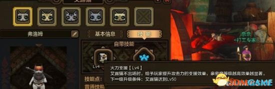 当3~4人组队狩猎时,艾露猫不出场,但会在场外给予猎人火力支援,而且分别可以在lv15,lv30,lv40时候升级!打开艾露猫面板(快捷键O),基本信息盘边有个“技能”,点开“技能”,把火力支援升到4级!