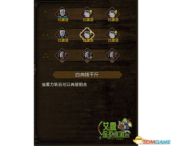 四两拨千斤(强蓄力斩可以再接拍击),这意味着大剑有了这个天赋之后可以站桩无限使用强蓄力斩+拍击+强蓄力斩的循环。