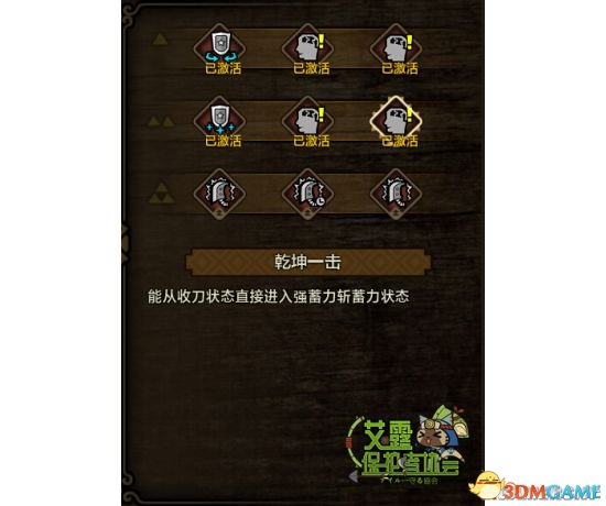 乾坤一击(能从收刀状态直接进入强蓄力斩状态),大剑第一刀可以直接进入强蓄力状态,能让大剑拔刀斩的伤害有一个巨大的提升。