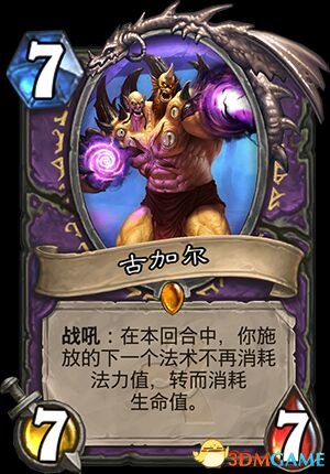 8、古加尔,一张以支付生命为代价的具有术士特色的单卡,术士的职业橙一直以高质量著称,不过这几个版本出的橙卡和当前版本不是很契合,目前术士的法术还不至于需要古加尔去替费,要是某个版本高cost高收益的法术出现,这卡倒有很大利用价值,前提还能有办法在自残后好好活着,还有一点就是无法用古加尔自杀,替费后会导致死亡的法术是无法获得替费效果的