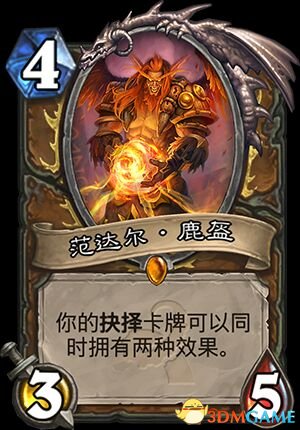 1、范达尔.鹿盔,这是一张出来就颇具争议的卡,有的人觉得很强有的人觉得一般,效果是抉择可以触发俩次,类似这种效果的卡我们能联想到,瑞文戴尔男爵:亡语触发俩次,布莱恩铜须:战吼触发俩次,这都是些很棒的特效,这是目前主流的几种触发机制,抉择作为小德独特的效果,其全部触发效果还是很强力的,蓝贴虽说鹿盔触发特效是抉择由左向右,可吧友后来验证是会选择最佳触发顺序进行。
