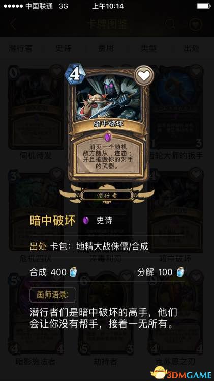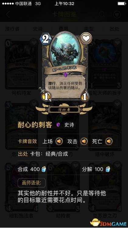 t2耐心的刺客:潜行99999-1虽然容易死于不明aoe,但是在aoe缺乏的jjc,这张牌前期上很容易卡到对面的节奏。只要不被挂起来烤,食尸鬼,打脸杂耍者打死都是妥妥的赚。后期抽一打一更是可以卡死对面大哥。但千万不要贪,可以吃就吃,吃个3费就不错了。抓位:不知道如何说,可以当作2费曲线补充好吧,也可以视作一个加强后期能力不稳定的解抓。