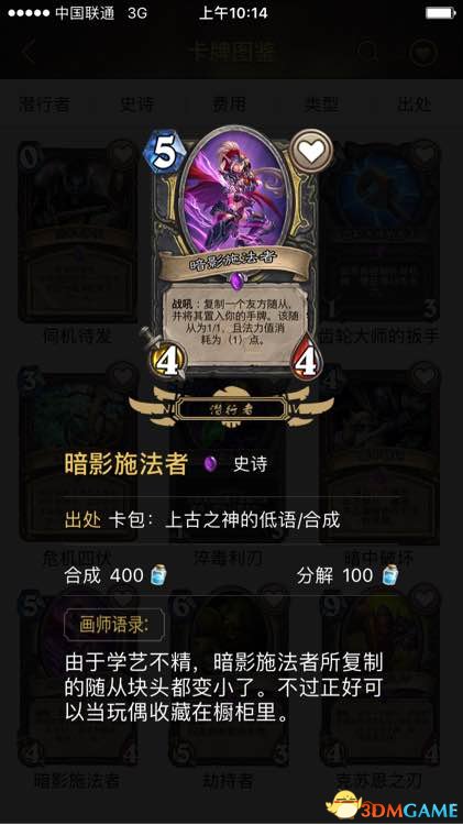 t3暗影施法者 一张一般的牌,如果功能性,亡语随从多。例如收割机,老司机,吹嘘海盗之类的。抓位大大提升。如果20抓以后发现前面一个功能没有。这张卡属于t4下级别