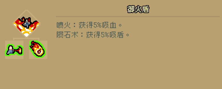 喷火提供吸血、陨石术提供护盾回复,同时喷火攻击频率高,打矿也比较好用