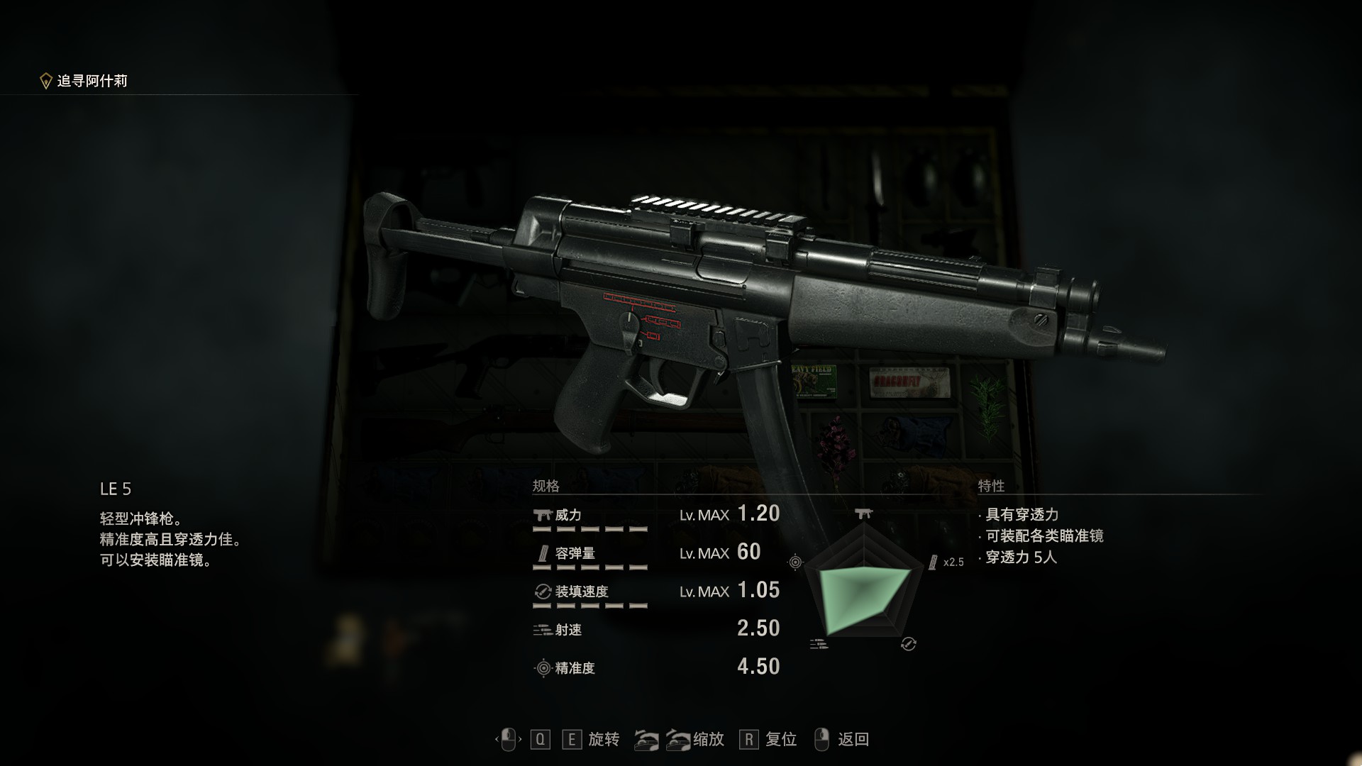 《生化危机4:重制版》是原作生化危机4的一部重置作品,是卡普空新推出的一款作品。LE 5是游戏中的一把武器,玩家只要把武器全部获得全,就能解锁一个成就。LE 5是一把冲锋枪,这个枪械第十三章于冷冻室电路解密解锁。