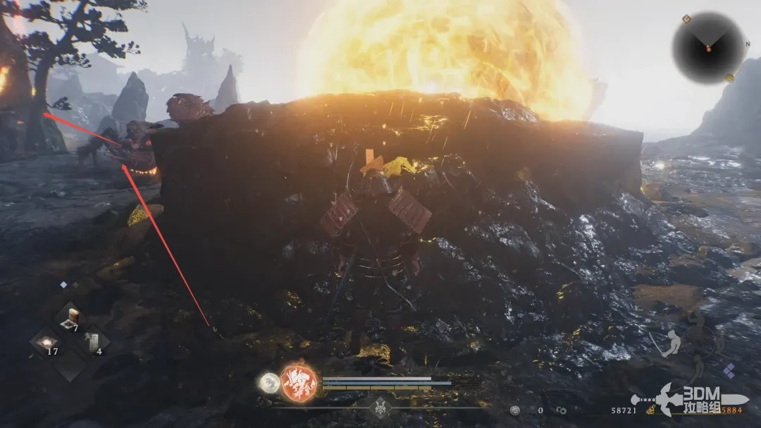 先不要去别的地方,站在这样的石头后面可以不被砸到,然后就这样一路躲着往左走。