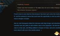 早在《暗黑破坏神3》发布之初,玩家便发现二代游戏中经典的“死灵法师”被取消了,有猜测认为该职业或将会在后续游戏内容中回归。而随着上周首部资料片“夺魂之镰”的正式发布以及全新职业“圣教军”的登场,玩家们似乎看到了“死灵法师”再度出现的希望。对于这一点,暴雪玩家社区管理者近日在回答玩家提问时予以了证实,确认死灵法师会在新资料片中回归,但在形式上有点特殊。首先是社区经理Vaeflare在回复中表示虽然目前暴雪只打算推出“圣教军”一个新职业,但玩家未来在“夺魂之镰”的故事中将有机会再次见到“死灵法师”的身影。随后,另一名为Grimiku的社区经理补充道: