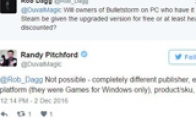 Gearbox Software创始人兼CEO Randy Pitchford确认之前购买过PC版《子弹风暴》的玩家仍然不能免费升级完全版游戏。Pitchford在Twitter上进行了解释。他说虽然Gearbox和《子弹风暴》的开发商People Can Fly合作推出新的版本,但本作原来是EA发行,导致老玩家免费升级不可能。此外,老版本是通过Games For Windows Live登陆的PC,而完全版并非如此。对此有玩家不同意。比如最近的《暗黑血统:战神版》,也换了发行商,但仍然可以免费升级。Pitchford解释说,Nordic从THQ手里彻底买下了《暗黑血统》系列过去和未来的版权,因此Nordic才可以重新推出游戏和给老玩家提供免费升级。Pitchford说Gearbox只是仅仅帮助People