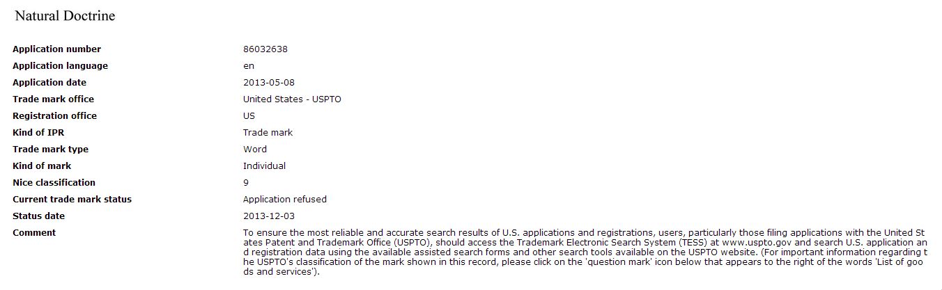 深入的分析这一案例,我们发现文件所陈述的拒绝理由是:“可能与现有商标‘Doctrine’出现混淆。发生这一问题的原因可能是游戏申请的商标类别太过普遍宽泛,《自然主义》竟然被评定为第9级别,也就是“具有重金属管弦乐队和重金属音乐乐队性质的预录光盘、录像带、激光磁盘和DVD音像制品”,这显然与游戏的范畴文不对题。