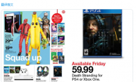 根据经常给玩家带来一手游戏零售业内信息的推特用户@Wario64爆料,美国仅次于沃尔玛的第二大零售百货集团Target,在发布最新的商品促销广告时,竟然给小岛秀夫的《死亡搁浅》印上了“PS4版或Xbox One版”。 虽然@Wario64直接打趣称Target是“泄露”了Xbox One版的《死亡搁浅》,但是相信大部分玩家都会认为这是Target商家的一次失误操作。毕竟小岛秀夫和索尼关系复杂,如今的《死亡搁浅》能够顺利成品发行,虽说靠他自己的广阔人脉,和索尼背后的资助显然也脱离不了干系。本周《死亡搁浅》登录PC的消息着实令不少玩家意外——和PS4版本之间的间隔还不到一年。但是后来被媒体挖掘出,其实在游戏公布的时候,小岛秀夫就已经明确暗示了《死亡搁浅》会登录PC。那么,小伙伴们认为《死亡搁浅》在较“新鲜”的时间