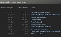 昨天,我们为大家报道过《上古卷轴5:天际》在Steam平台的游戏在线人数超过了23万,仅仅过去一天,这个纪录再次被刷新,目前,该作Steam平台的游戏在线人数已经突破了27万,速度十分惊人!在PC游戏销售一直尴尬的当今而言,这无疑给了游戏厂商对PC游戏的一点信心吧! 而今年最为火爆的FPS游戏《使命召唤8:现代战争3》在PC上的玩家数量却仍然尴尬,也是相隔一天,该作的Steam平台最高在线人数值才增加了1000。今天的Steam游戏在线人数排行榜昨天的Steam游戏在线人数排行榜