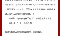 12月30日,网易游戏发布了元旦假期未成年人游戏限时通知,在2025年元旦假期期间,未成年人仅可在2025年1月1日当天20时至21时体验网易游戏,时长共一小时,其余时间均是禁止游玩时间。