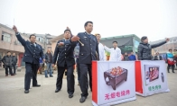 2013年2月3日,武汉市东西湖区南山美食市场内,9名城管队员依次上台,表演了一出《城管新风貌》的锣鼓词小品。只见这9名城管队员手执铁锣、腰系响鼓,一名扮演妇人的城管队员唱道:“羊肉串、猪肉串,烟子围绕房子转,眼睛睁不开,泪水直打转,这叫我们咯——么能把身安!”原来,这就是武汉市东西湖区城管局为取缔炭火烧烤而想出的“奇招”。而这一招的效果还真是不错:东西湖区的118处炭火烧烤点中,有104处已不再用炭火烧烤。图为小品表演现场。城管执法队员敲锣倡导绿色烧烤: