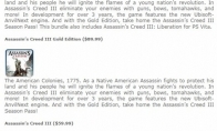 PlayStation北美官方博客的文章表明育碧为《刺客信条3》(AC3)设计了价值30美元的DLC季票(即DLC期权): 凡付90美元购买所谓《刺客信条3黄金版》的玩家均获赠该季票,若多掏30美元则再送《刺客信条3:解放》PSV版。考虑到游戏本体索价60美元,可推算出与游戏配套的DLC季票单售30美元。