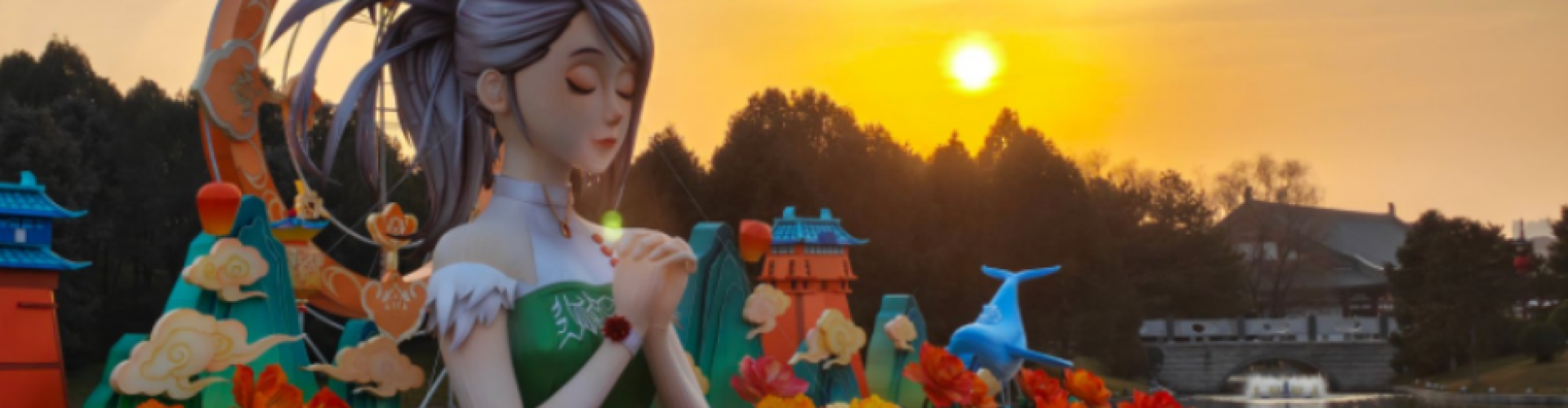 “元功门”前的广场,身着华服的女官和乐师,用来自大唐的“东仓鼓乐”,重新编曲演奏《地下城与勇士:起源》的经典音乐。而在其身后的,是牡丹簇拥的巨型的非遗花灯,静地在芙蓉湖中央“祈福”。直到无人机,将“赛丽亚”点亮,照耀整个会场。
