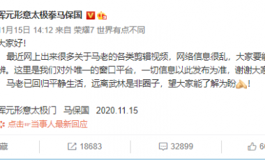 11月15日,由于各类鬼畜视频而再度翻红的马保国,在官方微博账号上发出了一条声明,目的是请求网友,不要被网络上的各种剪辑视频所误导。声明的最后,有这么一句话:“马老已回归平静生活,远离武林是非圈子。” 在宣布退出武林前,马保国自称是“浑元形意太极门”的掌门,是一代“太极拳宗师”。之前在网络上炒得沸沸扬扬,像“微博武术”这样的官方账号,似乎都坐实了其“大师”的称号。直到其在今年5月份的一场约战中,被搏击教练王庆民30秒KO,才暴露了其“假大师”的真实身份。 “假大师”的身份被揭露,马保国按理说应该已经“社会性死亡”了才是。然而令人意想不到的是,因为一段马保国被打得鼻青脸肿,却依旧嘴硬的视频,马保国成功进军B站“鬼畜全明星”,甚至已经达成了在B站“屠榜”的成就,成为了全网狂欢的对象。 诸如“年轻人不讲武德”、“我大